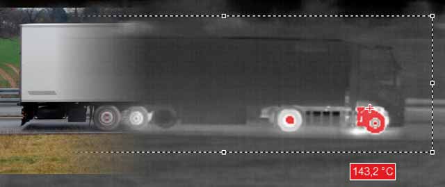 某卡車的實際圖像和熱圖像重疊。紅外掃描熱像儀測量到的輪胎最高溫度達到了143.2 °C。